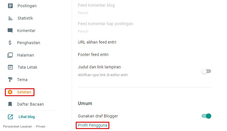 - Buka Blogger.com > Pengaturan / Setelan > Umum > Profil Pengguna